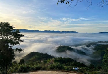 Nằm trên đỉnh đồi cao 1000m, nơi biển mây và rừng nguyên sinh hòa quyện tạo nên không gian yên bình.